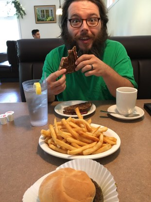 But we were hungry, and as much as we knew ice cream for dinner was the cheapest option, we felt like relaxing a bit in the air-conditioned restaurant, so we settled on a meal of cheap, real food before dessert. I went with a veggie burger (they’re very tasty) and Ross went with a reuben, I believe. We both shared a gargantuan plate of very good fries.