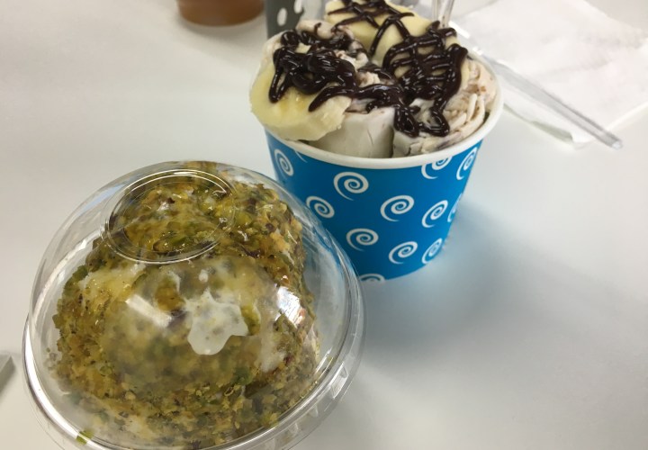 Next up was my first time having rolled ice cream. Also known as Thai-style ice cream, it was very fun to watch the ice cream as it was made in front of us. As is common at a lot of these places, you start by choosing your base, and then you can choose mix-ins and/or toppings to go with it.