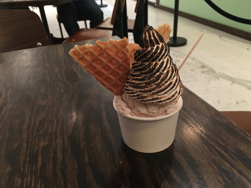 This is a spot with tiny wooden spoons, interesting free sprinkles and cone pieces, and “toasted fluff” that they use a blow torch for.