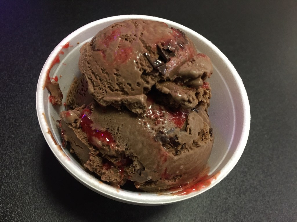 Chocolate Strawberry – This is a chocolate base with a chocolate shell and strawberry jam. It’s very creamy, light chocolate, without a ton of depth to it, but when combined with the texture of the chocolate pieces and the tasty strawberry jam it’s like a sundae in every bite! The strawberry chunks in the ice cream can be frosty, but the jam is consistent throughout and makes each bite delightful. This is very good, and it was my favorite of the visit.